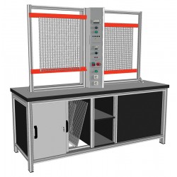 • 1 piètement permettant de ranger 8 grilles (4 de chaque côté de dimensions max 660 x 600mm) dans un espace fermé par des portes coulissantes équipées de serrures. 2 étagères centrales pour rangement d’outils, de la filerie...etc...