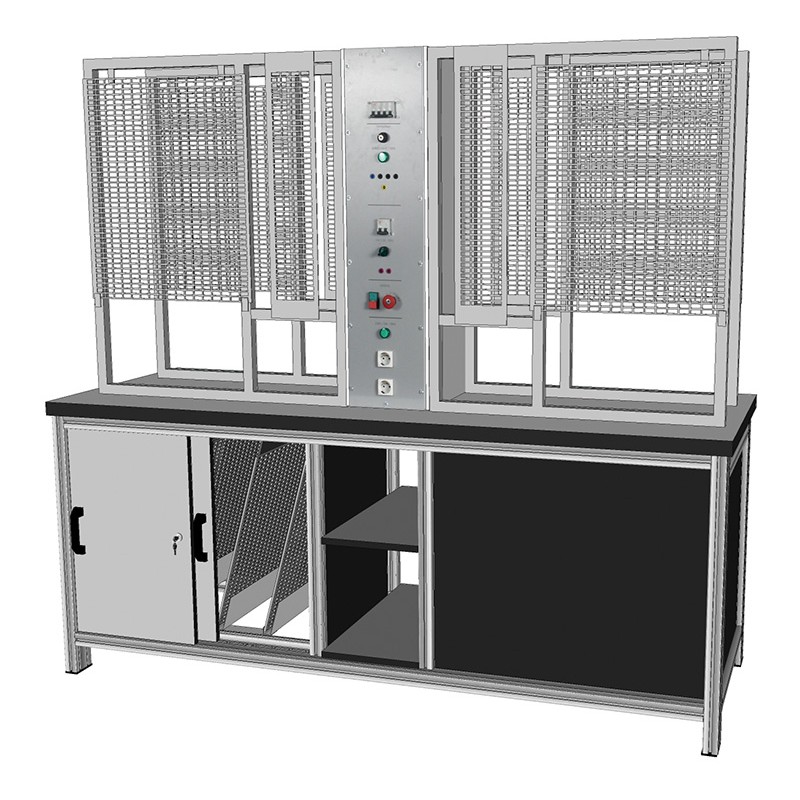 • 1 piètement permettant de ranger 8 grilles (4 de chaque côté de dimensions max 660 x 600mm) dans un espace fermé par des portes coulissantes équipées de serrures. 2 étagères centrales pour rangement d’outils, de la filerie...etc...