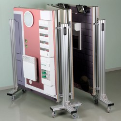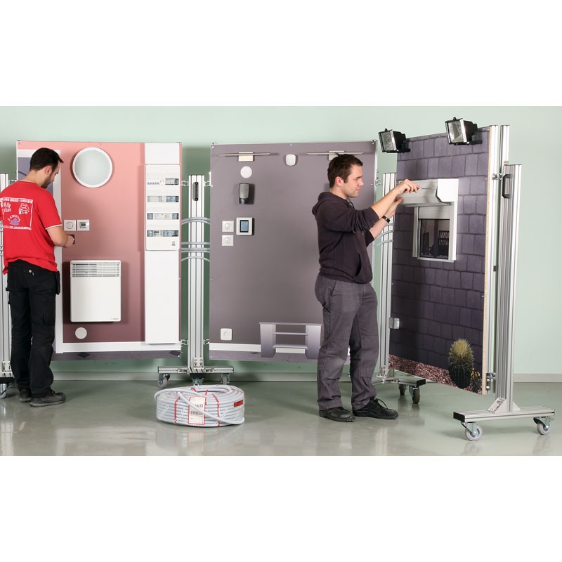 La structure aluminium du châssis permet le passage des gaines ICTA sur toute la hauteur du panneau. Les faces (ep12mm) d’un panneau sont séparées de 120mm ce qui est très confortable pour intégrer des composants électriques, des pots de cloison de 50mm et autres boîtes de raccordement encastrées. Les différentes faces sont fixées grâce a un système de vis ¼ de tour permettant un montage/démontage aisé en fonction des séquences pédagogiques.