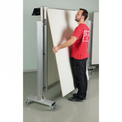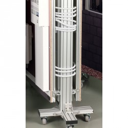 Structure mobile sur roulettes pivotantes avec frein et blocage en rotation, composée de trois panneaux sérigraphiés 1200 x1600mm. Des charnières permettent de plier et déplier l’ensemble à l’identique d’un paravent.