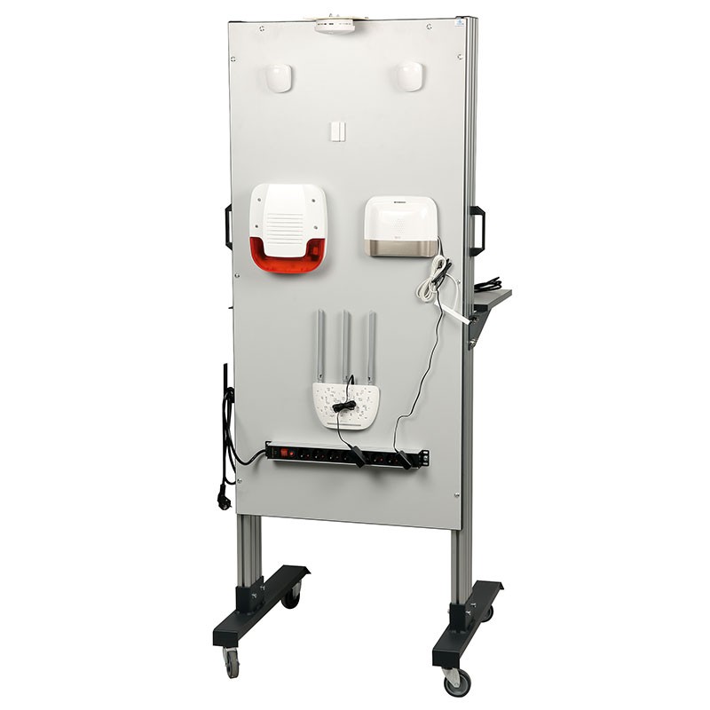 Panneau d’étude et de programmation d’une centrale d’alarme anti-intrusion sans fil avec sirène. La centrale est équipée de 4 détecteurs passif infrarouge, d’un détecteur magnétique déclenché par l’ouverture de la fenêtre. A distance, le clavier à code met l’alarme sous ou hors surveillance. Un transmetteur GSM signale tout déclenchement de l’alarme sur un téléphone mobile (non livré). La centrale peut être commandée par les 2 télécommandes.