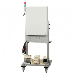 Système pédagogique totalement autonome une fois relié à une prise secteur 400V triphasée. Sélection du type de démarrage moteur souhaité par boutons poussoirs en façade de l’armoire électrique. Un moteur asynchrone d’une puissance de 300W, un frein à poudre, une dynamo tachymétrique sont directement fixés sur le châssis à roulettes.