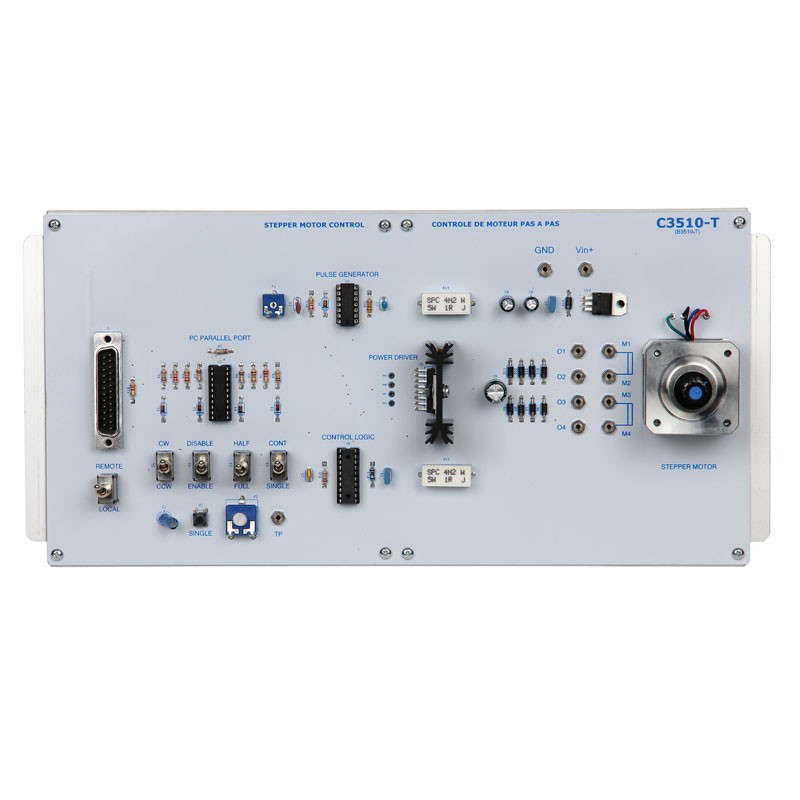 Includes a stepping motor with 2 separate coils, the motor driver and the specialised logic test circuit.